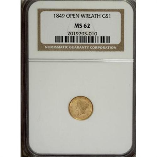 <B>1849 G$1 Open Wreath MS62 NGC.</B></I> With L, Large Head. The rich sun-gold surfaces offer soft, pleasing luster and solid detail. An attractive coin for the grade, though kept from a finer designation by wispy abrasions.<BR><BR><B>Coin Engraver:</B> James B. Longacre<BR><BR><b>Shipping:</b> Coins & Currency (<a target="_blank" href="http://www.heritageauctions.com/common/shipping.php">view shipping information</a>)