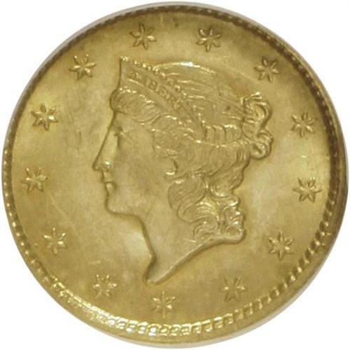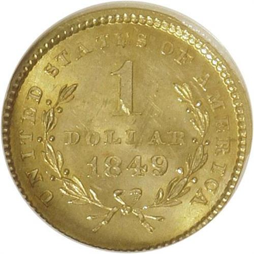 1849 G$1 Open Wreath MS63 NGC. NGC Census: (536/610).