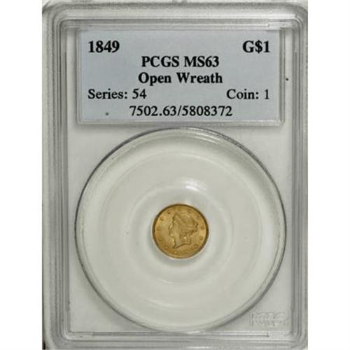 <B>1849 G$1 Open Wreath MS63 PCGS.</B></I> Large Head, With L. An original green-gold example of this scarce single-year subtype. Boldly struck and shimmering with a faint vertical graze on the portrait.<BR><BR><B>Coin Engraver:</B> James B. Longacre<BR><BR><b>Shipping:</b> Coins & Currency (<a target="_blank" href="http://www.heritageauctions.com/common/shipping.php">view shipping information</a>\)