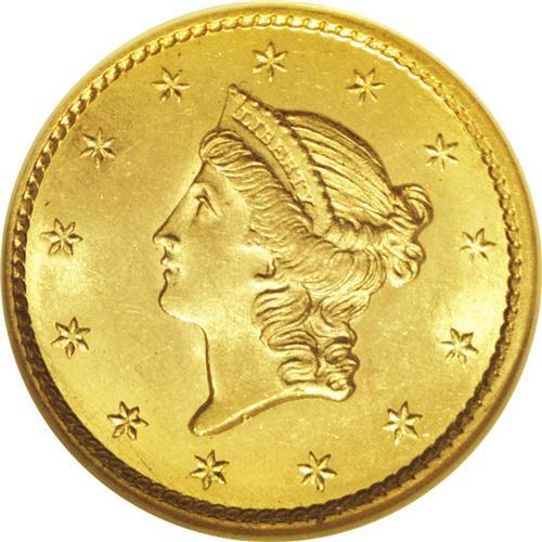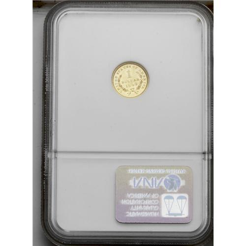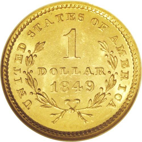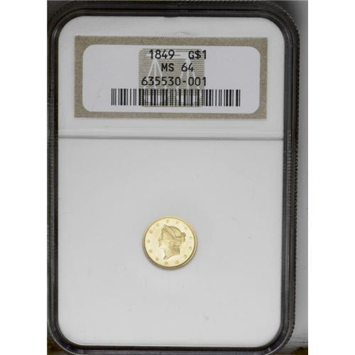 <B>1849<G$1> Open Wreath MS64 NGC.</B></I> Large Head, With L. The R in DOLLAR and the E in UNITED appear to be recut. A lustrous honey-gold near-Gem with an exquisite strike and carefully preserved surfaces. Moderate amounts of reflectiveness are seen surrounding the devices, a result of excessive die polishing.<BR><I>From The Chief Paduke Collection.</B></I>