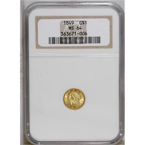 <B>1849<G$1> Open Wreath MS64 NGC.</B></I> Large Head. With L. This beautiful near-Gem is awash in scintillating luster, and only a solitary hair-thin roller mark above the jaw prevents an even finer grade. Well struck, and a worthy representative of the briefly issued Open Wreath type.