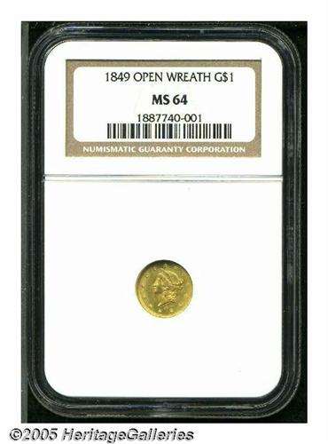 <B>1849<G$1> Open Wreath MS64 NGC.</B></I> Large Head, with L. A lustrous and well struck example of the short-lived Open Wreath subtype. Tiny mint-made strike-thrus frequent the central obverse, however, luster grazes are few and unimportant.