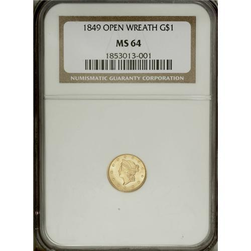 1849 G$1 Open Wreath MS64 NGC. The fresh, frosty lemon
