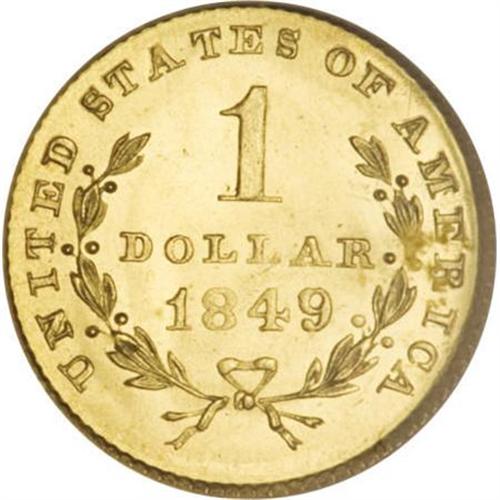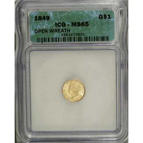<B>1849 G$1 Open Wreath MS65 ICG.</B></I> A sensational Gem with extraordinary light yellow-gold luster and full mint brilliance. The strike is generally full, with softness apparent only at the date. The surfaces are creamy and pristine, with only a few faint lines and marks. A highly appealing piece that will please the connoisseur.<BR><BR><B>Coin Engraver:</B> James B. Longacre<BR><BR><b>Shipping:</b> Coins & Currency (<a target="_blank" href="http://www.heritageauctions.com/common/shipping.php">view shipping information</a>)