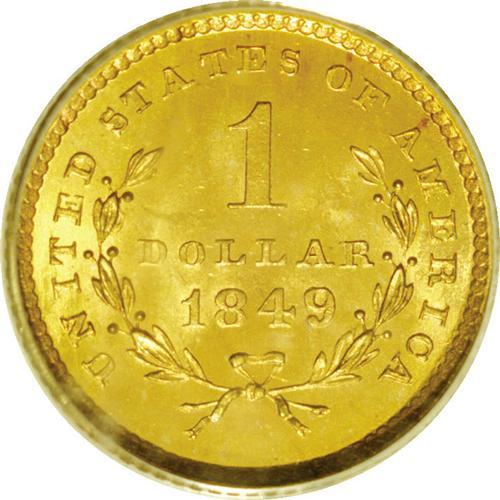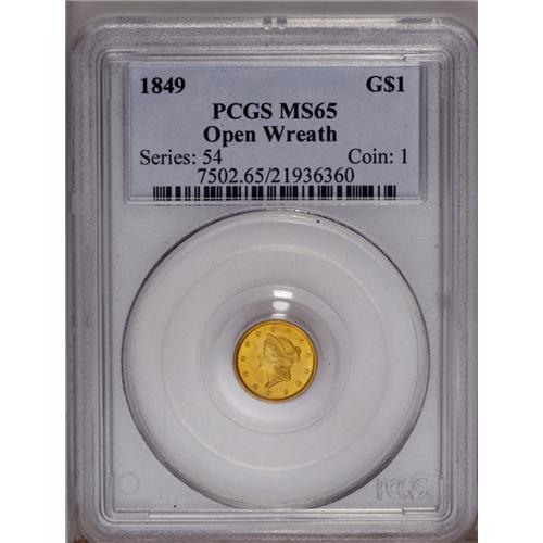 1849 G$1 Open Wreath MS65 PCGS. Large Head, With L. Ra