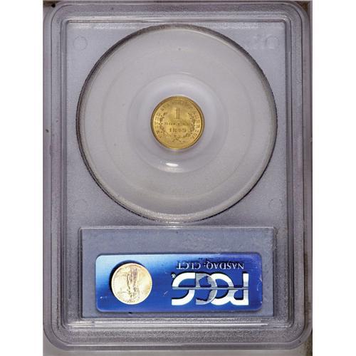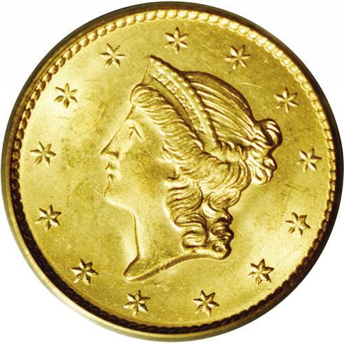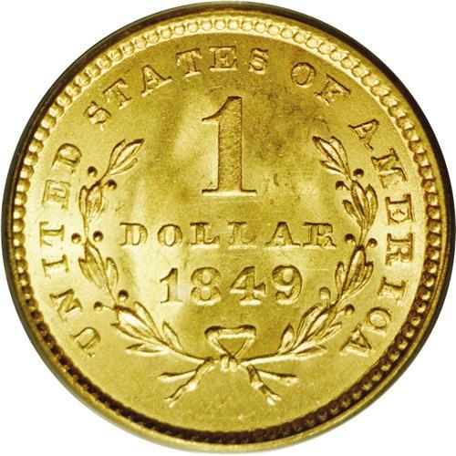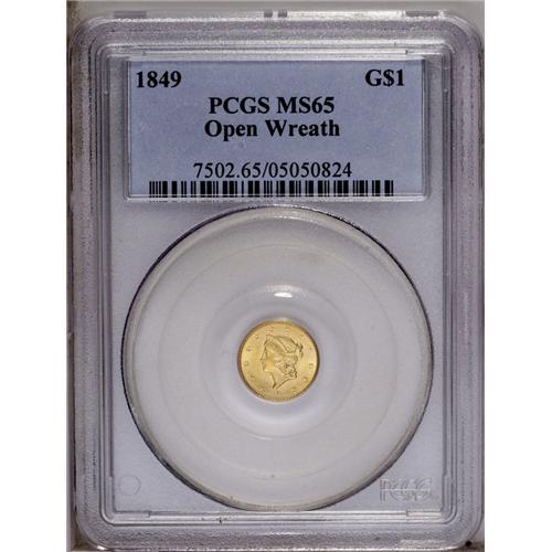 <B>1849<G$1> Open Wreath MS65 PCGS.</B></I> Large Head, With L. This is a highly attractive and extremely sharp example of this very first year for the denomination. The surfaces are fully brilliant with reflective and satiny greenish-gold fields. The centers of each star have a distinctive look, a result of the punch used to enter the stars in the die. These are similar to the hollow stars of the 1859 half dimes and dimes, although not exactly alike. Population: 43 in 65, 14 finer (3/06). <BR><BR><B>Important notice:</B> Heritage usually auctions material at the rate of 200-250 lots per hour. On some occasions eBay Live bid software or the Internet may not be able to keep up with the pace of the auction. We recommend placing a realistic absentee bid now as insurance to avoid disappointment. Occasionally the auctioneer may eliminate or reject an eBay Live bid, and the auctioneer may also reopen a lot after the close of the eBay live bidding (usually because we missed an audience bid), and may reject your bid even if it shows you as the winning bidder. By bidding via eBay Live, you agree that Heritage may award the lot to another bidder at its sole discretion under the circumstances described above or any other reasonable circumstances. Since eBay bids are not shown to us until we open the lot on the floor, we treat those bids just like floor bids. In most cases the floor responds before the eBay bid is presented to us, due to Internet lag time, so for consistency we have made it a policy that floor bids are always considered first over tie eBay live bids. Also please note that all Heritage lots purchased through eBay Live carry a 20% Buyer's Premium. Please make sure you read the Terms and Conditions before you bid. This lot is being auctioned in conjunction with a live floor auction by Heritage Galleries & Auctioneers. All final auction and invoice information will be supplied by Heritage Galleries & Auctioneers, and all other information should be considered preliminary. Lot:2245 <BR><BR><B>Winning Notification and Billing:</B> After the FINAL session in this auction is complete, Heritage will send e-mail and snail mail invoices. This process normally takes several days. All final auction and invoice information will be supplied by Heritage Galleries & Auctioneers, and all other information should be considered preliminary. <BR><BR>This auction will be conducted on a live auction floor and over the Internet through eBay Live. If you choose to place an absentee bid, please take a moment to <font color='#0000ff'><u><a href='http://pages.ebay.com/liveauctions/help/before/laabsentee.html'>learn how eBay Live absentee bidding works</a></u></font><font color='#000000'>