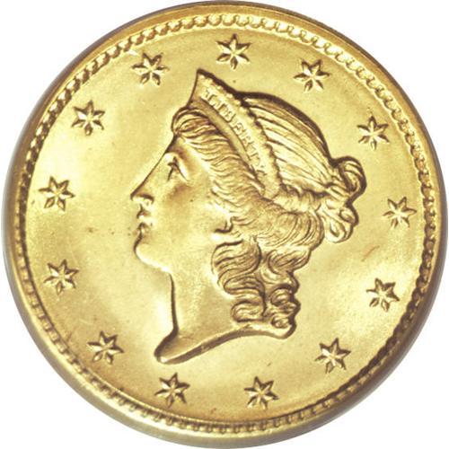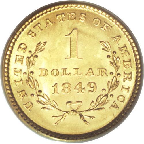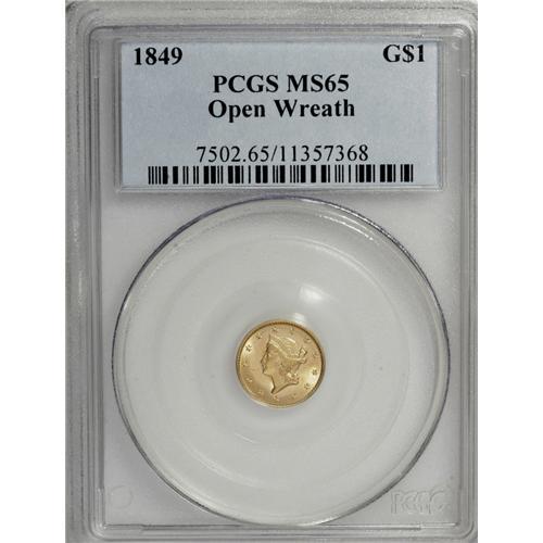 <B>1849 G$1 Open Wreath MS65 PCGS.</B></I> Large Head, With L. The 1849 Open Wreaths of both types (Large/Small Heads) are generally more difficult to find than the Close Wreath variety. This Gem displays potent luster and sharply struck design elements. Pleasing yellow-gold color adorns relatively well preserved surfaces. Population: 44 in 65, 15 finer (2/07).<BR><BR><b>Shipping:</b> Coins & Currency (<a target="_blank" href="http://www.heritageauctions.com/common/shipping.php">view shipping information</a>)