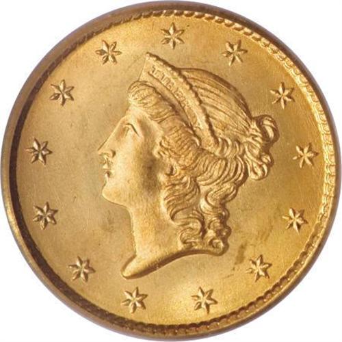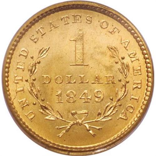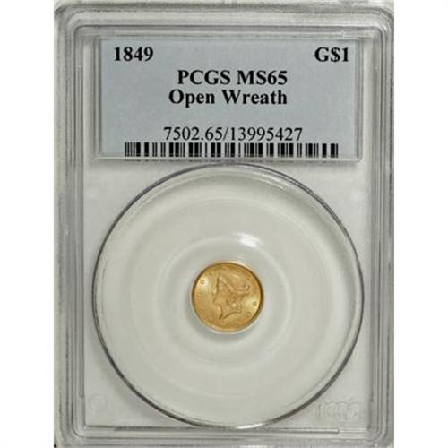 <B>1849 G$1 Open Wreath MS65 PCGS.</B></I> Large Head. A stunning beauty with amazing cartwheel luster and exceptional design definition. This piece ranks high in the condition census for the variety, although a few better ones have been certified. The surfaces are pristine with amazing eye appeal. Population: 46 in 65, 14 finer (8/07).<BR><BR><B>Coin Engraver:</B> James B. Longacre<BR><BR><b>Shipping:</b> Coins & Currency (<a target="_blank" href="http://www.heritageauctions.com/common/shipping.php">view shipping information</a>)