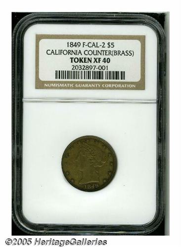 <B>"1849" Game Counter XF40 NGC.</B></I> F-CAL-2 $5. Struck in brass, this game counter is the approximate size of a Half Eagle and bears an imitation of the Liberty $5 obverse. The reverse depicts a miner examining a nugget (or the skull of Yorick) with palm trees in the background. A circulated piece with a few moderate marks and spots.