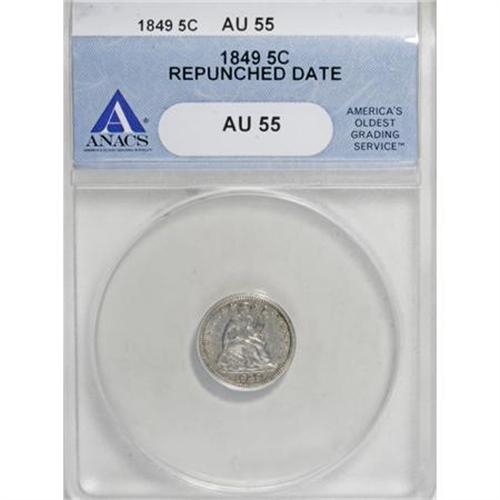 <B>1849 H10C --Repunched Date--AU55 ANACS.</B></I> . NGC Census: (3/80). PCGS Population (5/49). Mintage: 1,309,000. (#4341)<BR><I>From The Al Blythe Collection of Half Dimes.</B></I><BR><BR><B>Coin Engraver:</B> Christian Gobrecht<BR><BR><b>Shipping:</b> Coins & Currency (<a target="_blank" href="http://www.heritageauctions.com/common/shipping.php">view shipping information</a>)