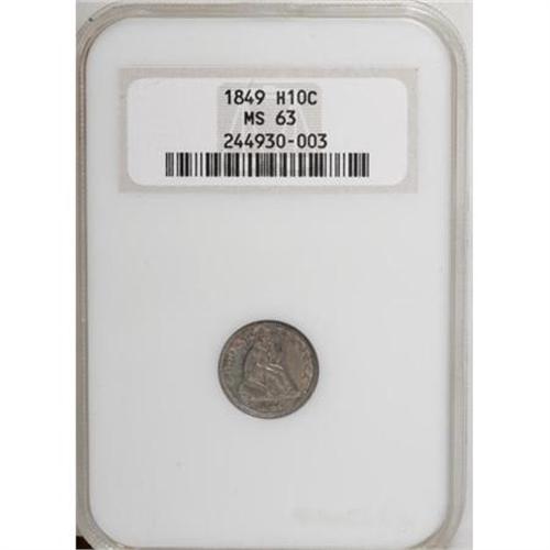 <B>1849 H10C MS63 NGC.</B></I> Repunched Date. NGC Census: (15/39). PCGS Population (10/16). Mintage: 1,309,000. Numismedia Wsl. Price for NGC/PCGS coin in MS63: $350. (#4341)<BR><BR><B>Coin Engraver:</B> Christian Gobrecht<BR><BR><b>Shipping:</b> Coins & Currency (<a target="_blank" href="http://www.heritageauctions.com/common/shipping.php">view shipping information</a>)