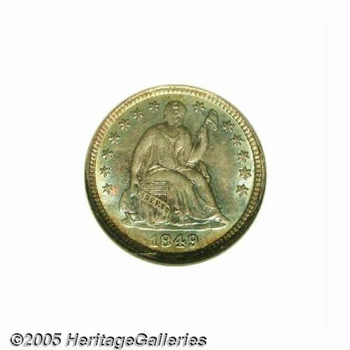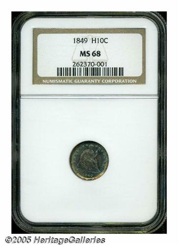 <B>1849<H10C> MS68 NGC.</B></I> With so many variations for the year, including recut dates and overdates, it seems that the normal or perfect date coins are the hardest to find. This is one of those perfect date examples that have no evidence of recutting of any sort. It is an incredible Superb Gem example with gorgeous toning on both sides. The surfaces exhibit full underlying satin luster, and are pristine, without marks of any sort. This is nearly the perfect coin, and is clearly the finest of this date ever certified. Population: 1 in 68, 0 finer (5/05).