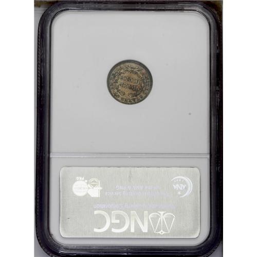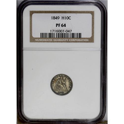 <B>1849<H10C> PR64 NGC.</B></I> A tiny mintage of proof half dimes were struck in this year, estimated by Walter Breen (1988) and Al Blythe (1992) to be perhaps as low as 5 pieces, though the number was perhaps slightly higher. At any rate, a mere five examples have been certified by NGC and PCGS. Moreover, our records indicate that probably no more than nine appearances have been seen in public sales within the past 15 years.<BR> The PR64 specimen offered here displays the die rotated approximately 180 degrees out of normal alignment, which is typical for the issue. Likewise, the repunching seen at the base of the 9 in the date is also typical of the '49 proof half dime. Luminous surfaces exhibit an underlying steel-gray appearance imbued with traces of speckled iridescent golden-tan and sky-blue. The design elements are sharply executed, and some wispy, inoffensive hairlines are noted in the fields.<BR> In an attempt to trace the pedigree of the coin in this lot, we compared it against photos of previous 1849 proof half dime appearances in those catalogs to which we had access. Based on this analysis, it appears that the present example may be the same as that in the Stack's October 1992 catalog of the Floyd T. Starr sale (lot 330). Census: 2 in 64, 0 finer (3/06). <BR><BR><B>Important notice:</B> Heritage usually auctions material at the rate of 200-250 lots per hour. On some occasions eBay Live bid software or the Internet may not be able to keep up with the pace of the auction. We recommend placing a realistic absentee bid now as insurance to avoid disappointment. Occasionally the auctioneer may eliminate or reject an eBay Live bid, and the auctioneer may also reopen a lot after the close of the eBay live bidding (usually because we missed an audience bid), and may reject your bid even if it shows you as the winning bidder. By bidding via eBay Live, you agree that Heritage may award the lot to another bidder at its sole discretion under the circumstances described above or any other reasonable circumstances. Since eBay bids are not shown to us until we open the lot on the floor, we treat those bids just like floor bids. In most cases the floor responds before the eBay bid is presented to us, due to Internet lag time, so for consistency we have made it a policy that floor bids are always considered first over tie eBay live bids. Also please note that all Heritage lots purchased through eBay Live carry a 20% Buyer's Premium. Please make sure you read the Terms and Conditions before you bid. This lot is being auctioned in conjunction with a live floor auction by Heritage Galleries & Auctioneers. All final auction and invoice information will be supplied by Heritage Galleries & Auctioneers, and all other information should be considered preliminary. Lot:1909 <BR><BR><B>Winning Notification and Billing:</B> After the FINAL session in this auction is complete, Heritage will send e-mail and snail mail invoices. This process normally takes several days. All final auction and invoice information will be supplied by Heritage Galleries & Auctioneers, and all other information should be considered preliminary. <BR><BR>This auction will be conducted on a live auction floor and over the Internet through eBay Live. If you choose to place an absentee bid, please take a moment to <font color='#0000ff'><u><a href='http://pages.ebay.com/liveauctions/help/before/laabsentee.html'>learn how eBay Live absentee bidding works</a></u></font><font color='#000000'>