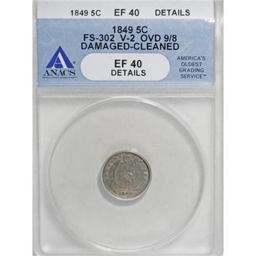 <B>1849 H10C 9/8 Overdate--Cleaned, Damaged--ANACS XF40 Details.</B></I> V-2, FS-302. NGC Census: (0/86). PCGS Population (5/61). Mintage: 1,309,000. Numismedia Wsl. Price for NGC/PCGS coin in XF40: $45. (#4341)<BR><I>From The Al Blythe Collection of Half Dimes.</B></I><BR><BR><B>Coin Engraver:</B> Christian Gobrecht<BR><BR><b>Shipping:</b> Coins & Currency (<a target="_blank" href="http://www.heritageauctions.com/common/shipping.php">view shipping information</a>)