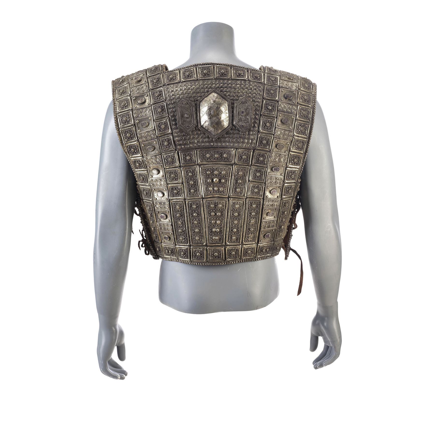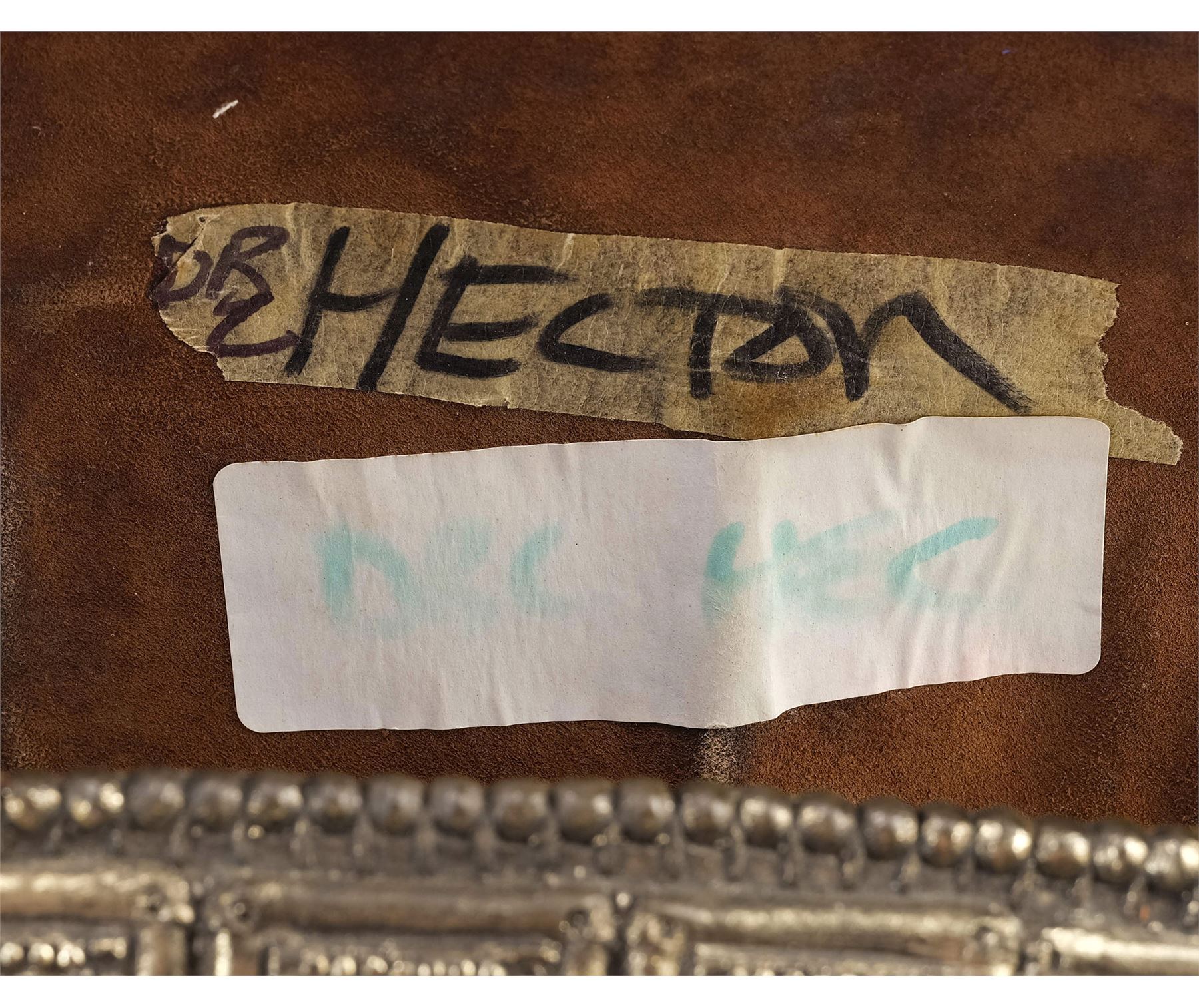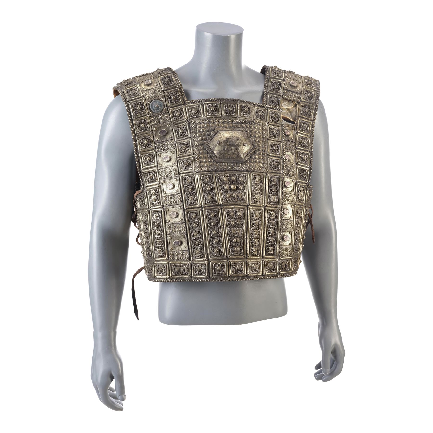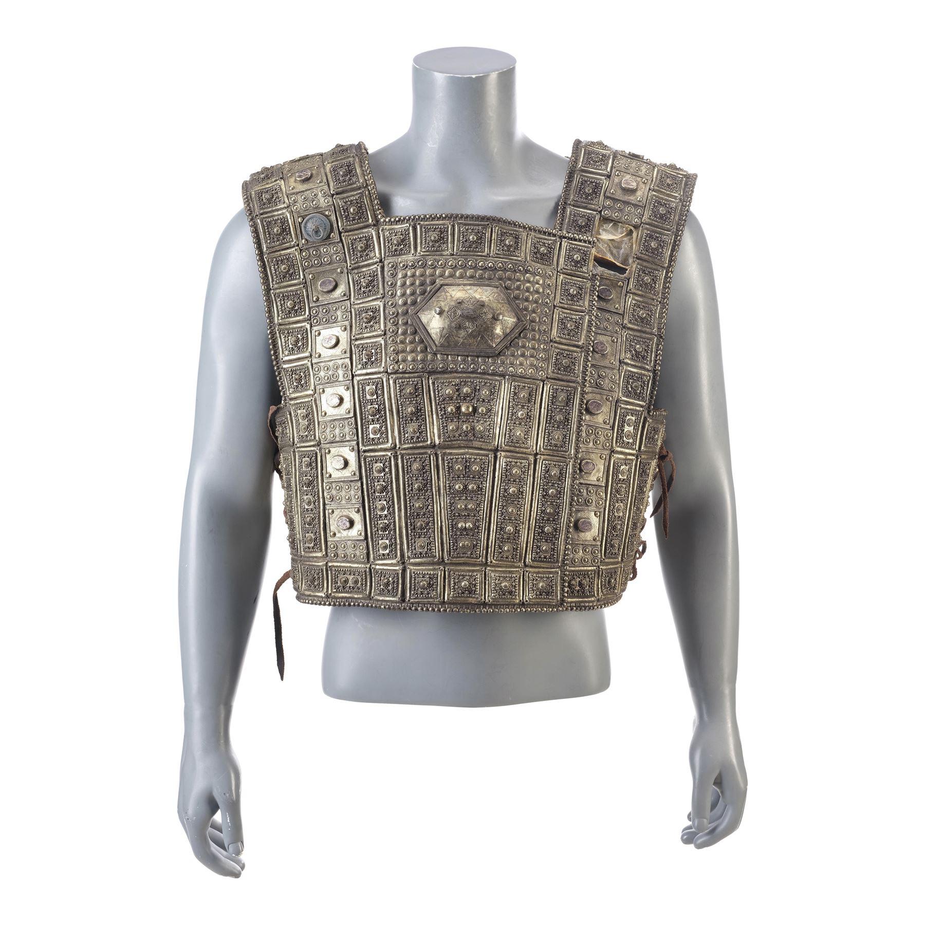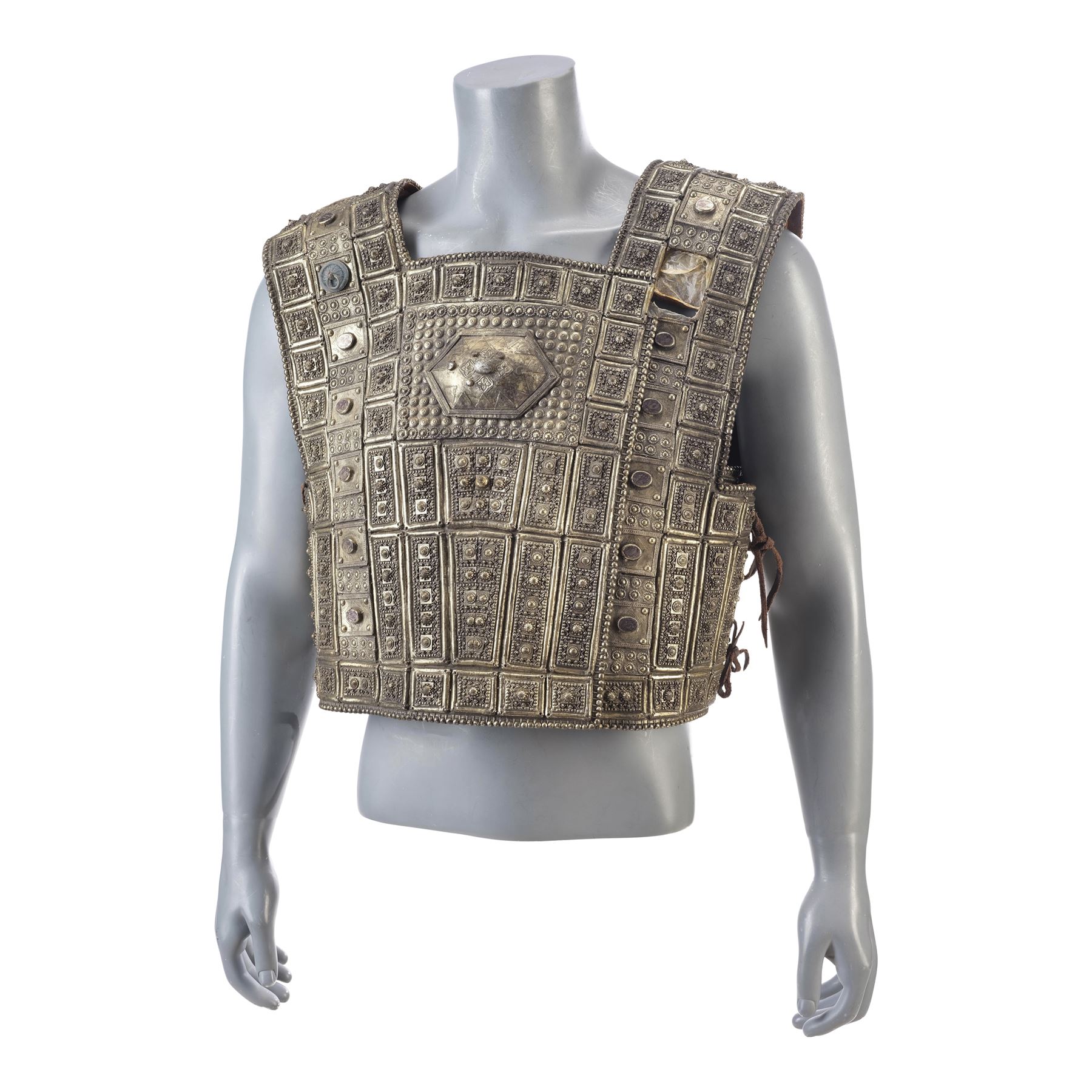 Created for Bana's body double, this leather-lined vinyl pull-over chest armor is textured and hand-painted to appear metallic with a gold-color finish and leather lace cinching straps on the sides. The interior features two labels hand-marked "DBL Hector" and "DBL Hec," respectively. The armor exhibits intentional distressing by production with a hole in the upper left shoulder and some grime applied to the armor to appear well-worn. The leather lining and laces exhibit some cracking and fraying from wear.