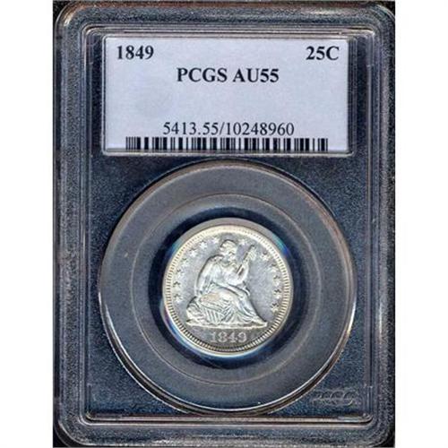 <b>1849 Liberty Seated Quarter Dollar. PCGS graded AU55.</b> A frosty example with extensive mint luster from top to bottom. Much of this issue was later melted <b>(PCGS # 5413)</b> <i>