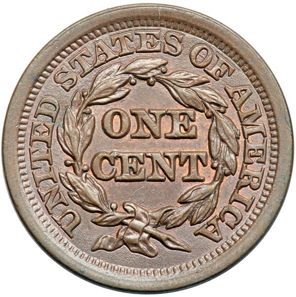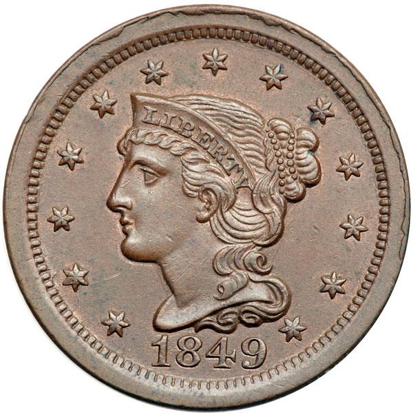 1849 N-1 R4 AU58. Frosty light steel brown with faded mint red in protected areas. Just a trace of light friction on the highest points from mint state. The only marks are a very faint hairline in the field right of star 2 and a barely visible rim bruise over star 4. MDS, die state c (Newcomb's #15), with crumbling inside the bottom of the R in AMERICA but without any additional crumbling under the left top of the E in CENT. The bar through the center of O in OF (which was Newcomb’s attribution point for his #15) is clear. An attractive cent with mint state eye appeal. CC#4 in the Grellman census. Removed from an ANACS slab graded MS63BN (ANACS label included). DWH #2118.