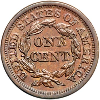 1849 N-10 R3. MS-60. Frosty light to medium chocolate brown with hints of light olive on the obverse. The surfaces are satiny and offer excellent eye appeal for the grade. This cent may have been lightly dipped long ago, but the toning appears natural and there is no evidence of artificial mint color. The only marks are a shallow planchet flake or low spot under star 1 and a tiny speck of dark toning nestled between two dentils right of star 8. MDS, die state c early. The lump on the coronet extends to below the center of star 6 and the obverse fields are just starting to display hints of extremely fine die rust. Tied for CC#2, and it comes with a nice provenance.