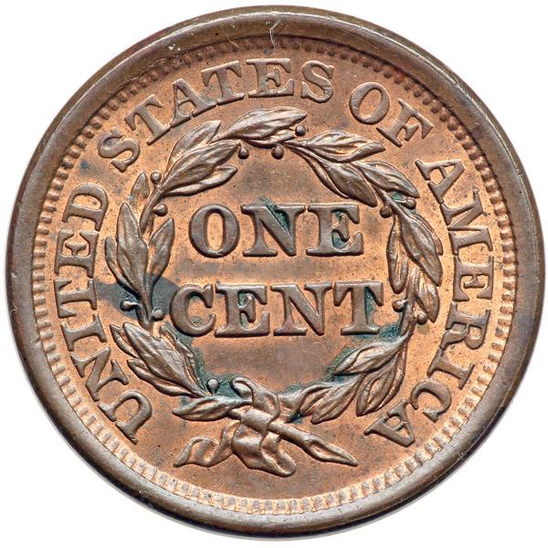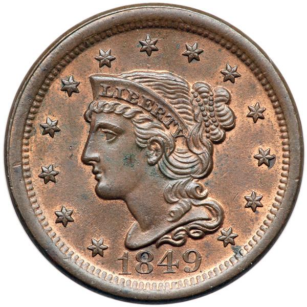 1849 N-12 R1 MS60+. Frosty steel brown and chocolate fading down from mint color with nearly a third of the original red remaining. Would rate a higher grade if not for a few small splashes of darker toning on both sides. M-LDS, die state b. The die lines over UN in UNITED are gone. Tied for CC#4 in the Grellman census.
