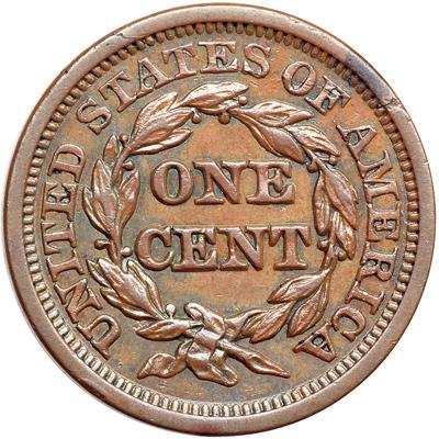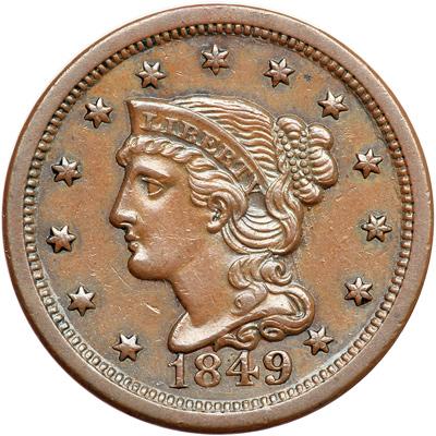 1849 N-14 R3. EF-45 Plus. Glossy light chocolate brown. An attractive cent, close to AU50. The only marks of any significance are a small spot of darker toning right of star 8 and a shallow planchet flake on the rim at the first A in AMERICA. Nicely struck E-MDS, die state b. The vertical line inside the triangle of the 4 is visible. Removed from an NGC slab graded MS62 Brown (NGC label included).