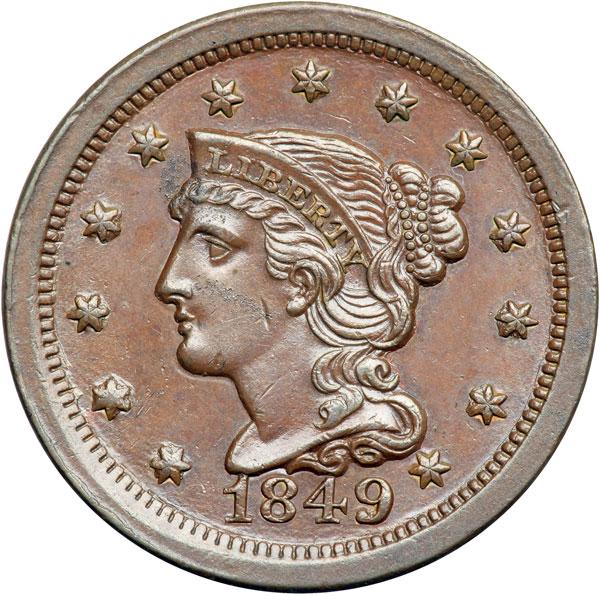 1849 N-16 R5 AU50. Slightly sharper but there is a diagonal nick left of the earlobe and patches of microscopic pinpricks at the browlock and cheek. Frosty steel brown and chocolate with peeps of very faded mint red in a few protected areas. MDS, die state c early. There is some die crumbling inside the bottom of the 9 and along the right bottom of star 7. Tied for CC#6 in the Grellman census. Noyes photo #30138. DWH #2129.