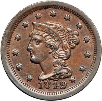 1849 N-16 R5. EF-40. Glossy medium brown and light chocolate with traces of faded mint red in protected areas, mostly on the obverse. This cent has the look of a slightly higher grade, and in fact it may qualify for an additional 5 points. No spots or stains and only trivial contact marks. The notable marks are a very faint hairline scratch from the peak of the 1 to the top of star 1 and fading out as it approaches star 2, a vertical nick in the field close before the lips, and a tiny rim nick off the end of the wreath stem. Rare EDS, die state a, before crumbling inside the bottom of the 9.