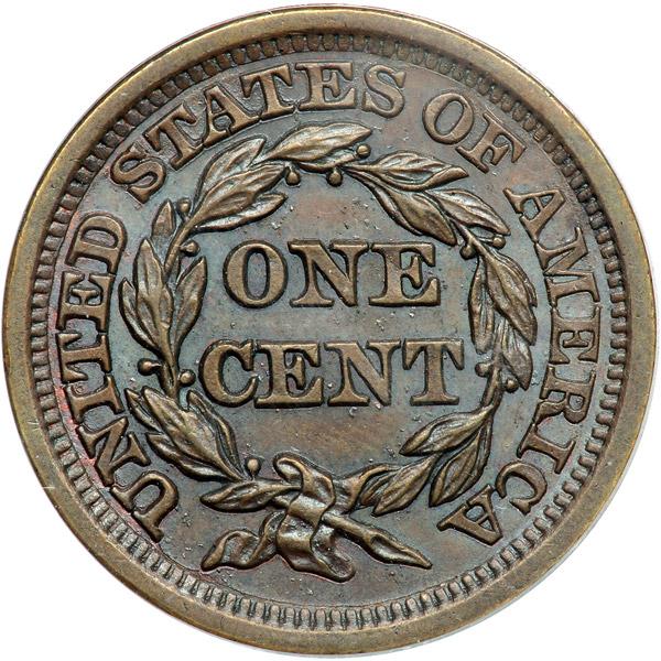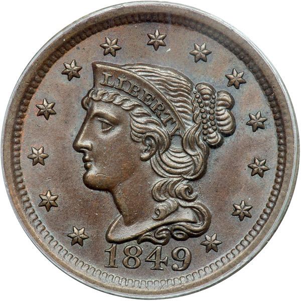 1849 N-17 R3+ PCGS graded MS64 Brown. Very attractive lustrous light chocolate with subtle overtones of light bluish steel in protected areas. A couple tiny peeps of faded mint red show on both sides. No spots or stains, virtually flawless. A light diagonal nick hidden in the dentils under the 4 is the best identifying mark. E-MDS, die state b. The fine die lines right of the T in CENT are sharp and many tiny lumps caused by die rust are scattered over the reverse. A neat intermediate die state for this scarce variety. Our grade is MS62, tied for CC#3 in the Grellman census. The attribution is noted on the PCGS label. Pop 1; 1 finer in 65BN.