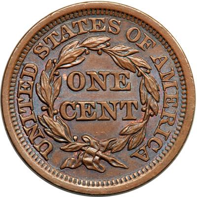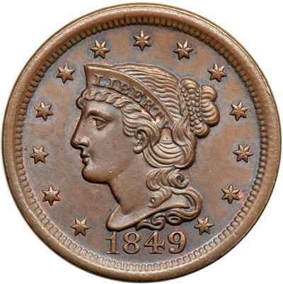 1849 N-17 R3+. MS-60 Plus. Lustrous light to medium chocolate and steel brown with overtones of bluish steel covering both sides. Traces of slightly faded mint red can be found on both sides. Outstanding eye appeal for the grade as satiny mint frost covers the planchet. It takes some searching to locate any identifying marks. A speck of darker reddish chocolate toning on the bottom of the front edge of the neck and a speck of verdigris resting on the right top of the D in UNITED are the best ones I can find. Nicely struck E-MDS, die state b early, with a fine die crack through the top of ME and shallow crumbling that connects the tops of CE in CENT. CC#6 for this scarce die variety.