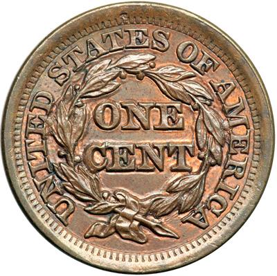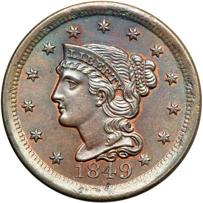 1849 N-2 R2. MS-60. Lustrous light chocolate and steel brown with overtones of bluish steel, especially on the upper half of the obverse. About 10% of the mint red remains visible, mostly on the reverse. The surfaces are covered with satiny mint frost and this cent offers excellent eye appeal. The notable marks are a tiny planchet flake at the dentils under the 4, a few more in the dentils over stars 5-7, and a tiny nick in the dentils over the left top of the E in STATES. M-LDS, die state q, with extensive die crumbling on the reverse. Tied for CC#7 overall but finest of the die state in the Grellman census.