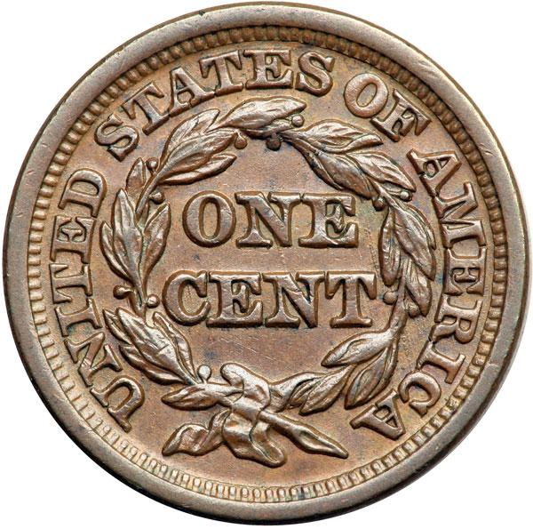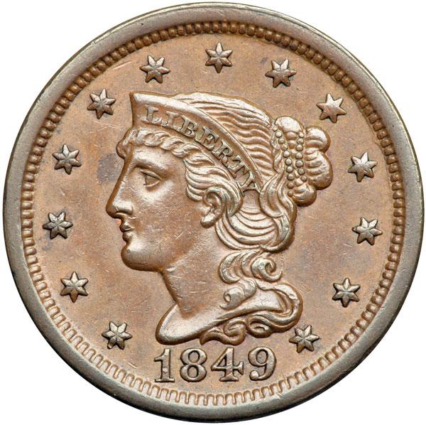1849 N-20 R1 EF45+. Glossy medium brown with frosty lighter brown covering the protected areas. A small splash of darker olive brown toning in the field right of star 4 is the notable mark. Sharp and attractive, close to AU50. E-MDS, die state a. The die lines are strong on both sides. DWH #1413.