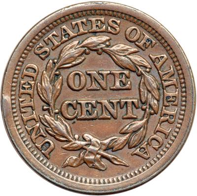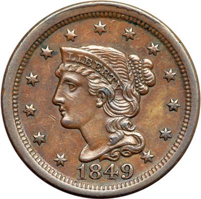 1849 N-21 R4. EF-40. Close to EF45 but there is a light rim dent at the T in UNITED plus a couple minor nicks on the obverse. Otherwise this cent is choice and the eye appeal remains excellent. Glossy medium brown and light chocolate. MDS. The die lines are still sharp. Tied for CC#10.