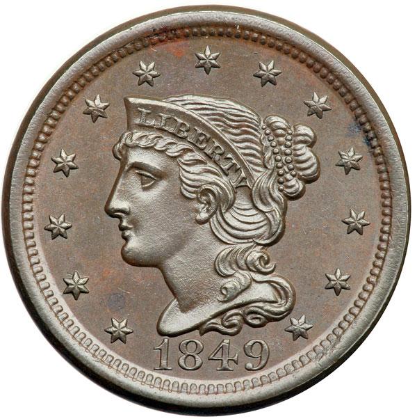 1849 N-22 R1 MS63. Choice glossy chocolate and darker steel brown with hints of underlying very faded mint color on the reverse. The only defects are a small spot of darker chocolate toning over star 1 and another in the dentils above star 10, neither at all distracting. Sharply struck MDS, die state c early. The die lines from the inner and main curls are gone. This is Newcomb's #6. Unbroken satiny luster and excellent eye appeal. Removed from an NGC slab graded MS65BN (NGC label included). DWH #2261.