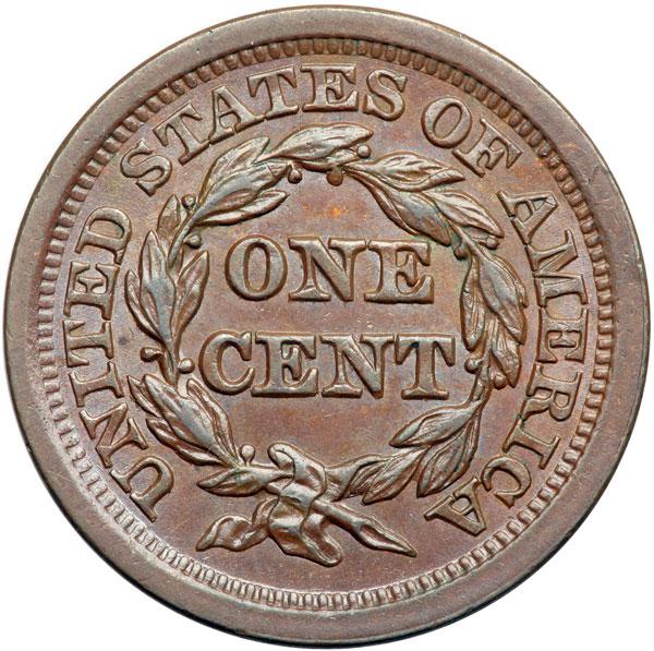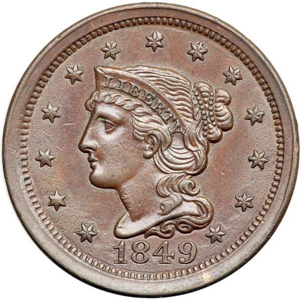 1849 N-23 R3 AU50. Glossy chocolate brown with frosty mint luster in the protected areas. The only marks are a tiny rim tick at star 11 and a slightly stronger one at the M. MDS, die state c. Crumbling covers the left and right tops of star 8. CC#8 overall but third finest of the earlier (pre-N-13) die state. Removed from a PCGS slab graded MS62BN (PCGS label included). DWH #2132.