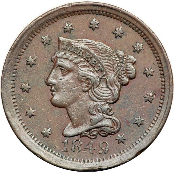 1849 N-23 R3 VF25. Sharpness EF40 with some light contact marks on both sides, including several light rim bruises, strongest under the 49. Glossy medium brown and chocolate with frosty luster in protected areas of the reverse. LDS, die state d, with the obverse die heavily lapped and fine repunching visible under the 1 & 49 (Newcomb's old #13). DWH #1420.
