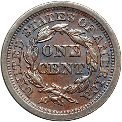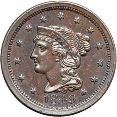 1849 N-23 R3. EF-45 Plus. Close to AU50 with just a few too many tiny contact marks for the higher grade. The notable marks are a very tiny rim nick under the 1 and a barely visible rim bruise over the first A in AMERICA. Very attractive lustrous chocolate brown with small peeps of original mint color on the reverse. Satiny mint luster covers the protected areas giving this cent the look of a higher grade. MDS, die state b. The obverse field is starting to show fine die rust around the date but there is no crumbling on the left top of star 8. Tied for CC#9 overall, but most of the nicer ones are from the late (old N-13) die state.