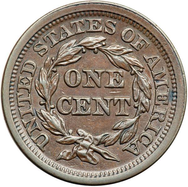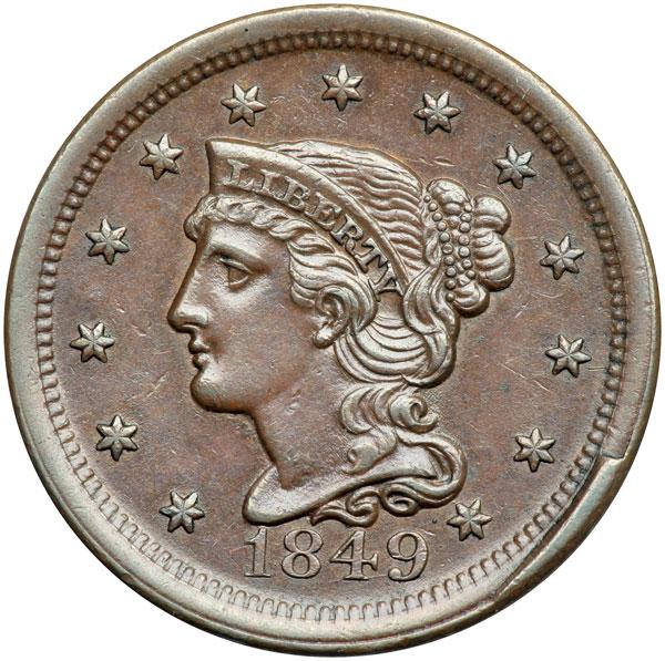 1849 N-24 R3 EF45+. Choice glossy chocolate brown with frosty mint luster in protected areas. The surfaces are smooth and attractive. The best identifying marks are a light diagonal nick-like planchet chip in the field off the chin and a horizontal nick under the E in ONE, plus a spot of darker olive toning at the dentils over the E in AMERICA. Extremely rare TDS, die state d, with a strong rim cud from star 12 down to slightly past star 13. Tied for CC#7 overall for the die variety and second finest of only 7 known in the terminal die state. DWH #2408.