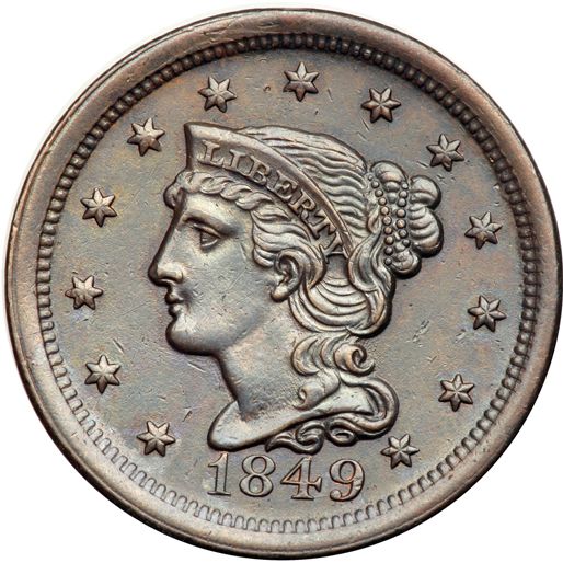 1849 N-24 R3 VF35. Ten points sharper but cleaned and recolored steel and olive with lighter tan and brown tones in protected areas on the reverse. No notable marks, but the recoloring was not especially effective. EDS, die state a. The die lines over UN are clear.