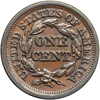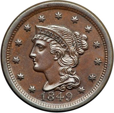 1849 N-28 R3. AU-55. Choice glossy light chocolate brown with underlying frosty mint luster showing through in the fields and protected areas. Great eye appeal, virtually flawless. The only mark is a faint hairline from the lips to the dentils over star 3. EDS, die state a. The fine die lines on the reverse are sharp. Tied for CC#6.