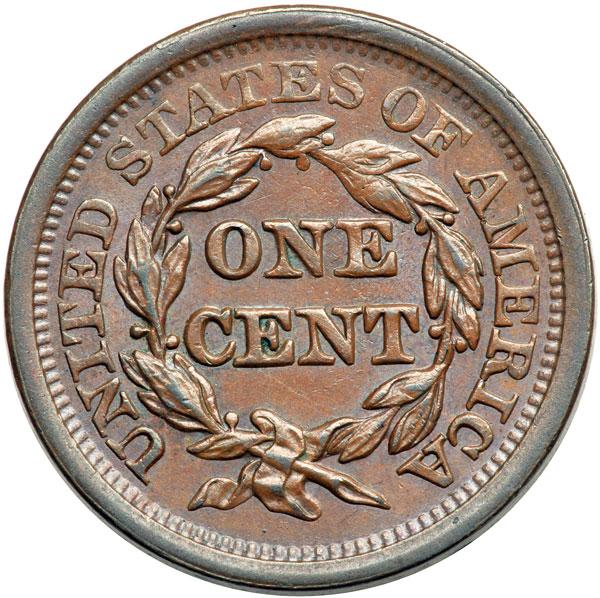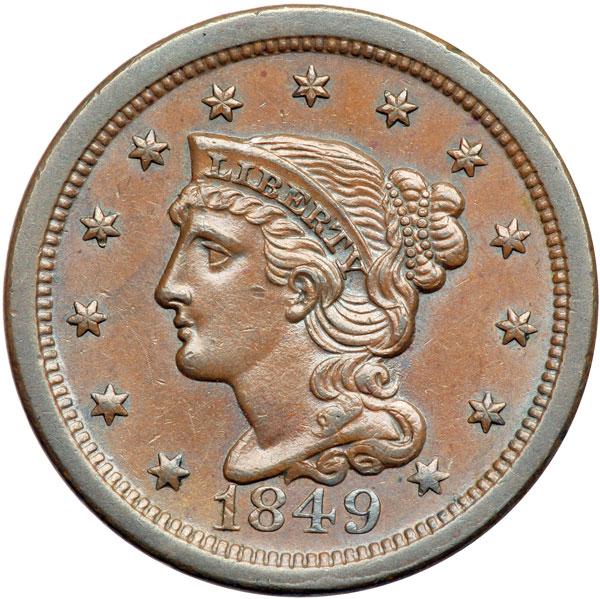 1849 N-29 R2 EF45+. Slightly sharper with a pair of small rim nicks at star 8 and a tiny pinprick under the left side of star 7. Attractive glossy medium brown with lustrous light bluish steel brown toning covering the protected areas. M-LDS, die state d. There is a thin, shallow rim cud under the 49 and star 13. Very attractive for the grade, close to AU50. DWH #1429.