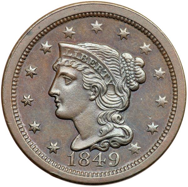1849 N-29 R2 MS62. Glossy bluish steel brown with hints of iridescent rose tones on the obverse and faded mint red covering about 20% of the reverse. There is a small spot of darker toning on the rim at star 5 and a very light and barely visible rim bruise under star 1 and another at the bottom of the reverse. Sharp EDS+, die state b, with a couple very tiny rim cud breaks under star 13. The fields are smooth and slightly reflective thanks to a fresh die polishing that gives this cent outstanding eye appeal. Tied for CC#2 behind a slightly finer example. DWH #2206.