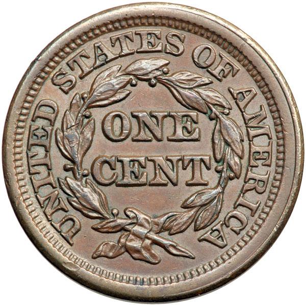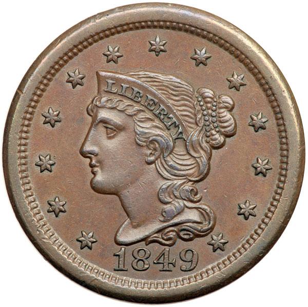 1849 N-4 R1 EF45. Glossy chocolate and steel brown with frosty mint luster in protected areas. The only marks are a light nick on the rim over F in OF and a shallow planchet flake on the rim off the ribbon tip, as struck. MDS, die state c early, with the fine die cracks at UNITED and STATE visible, and some of the die lines over UN still present. The edge of the planchet is beveled on the obverse only (seen on both sides for some die states of N-5 and N-8 of this year). DWH #1387.