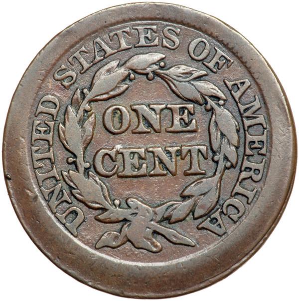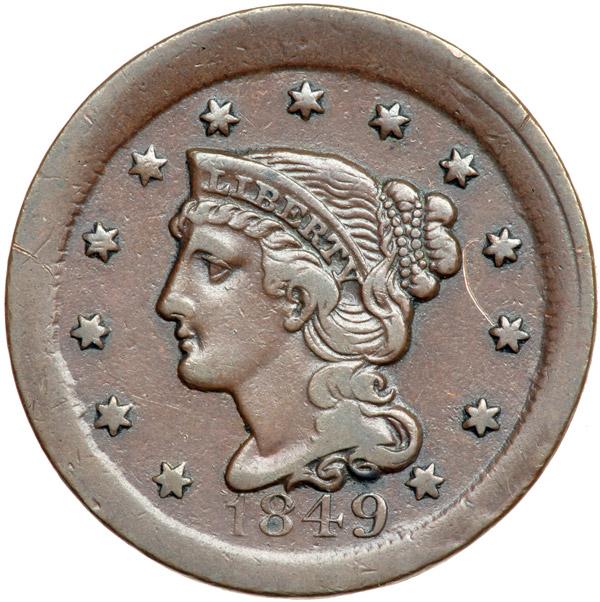 1849 N-5 R3+ F15+. Broadstruck. Sharpness VF20 but there is a fine, fresh pinscratch from star 10 to star 11. Otherwise the surfaces and eye appeal are excellent. Glossy chocolate brown. M-LDS, die state f. Broadstruck (struck outside the restraining collar) leaving wide rims all the way around both sides. DWH #3340.