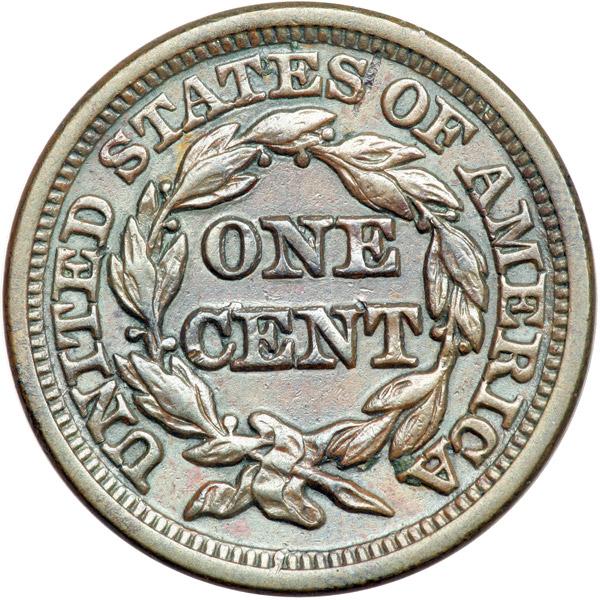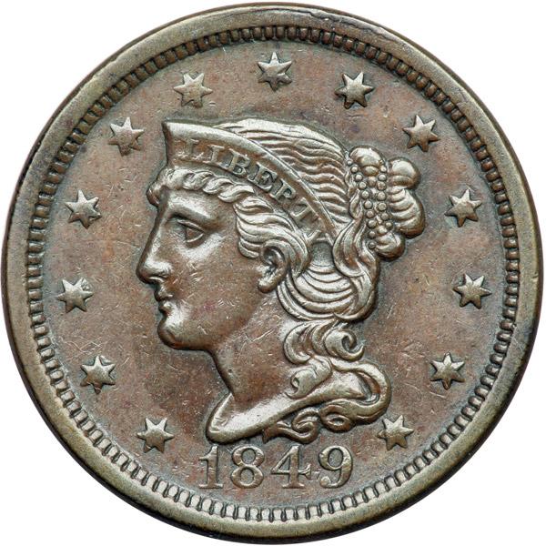 1849 N-9 R4 EF45. Glossy light olive and bluish steel brown. Nicely struck and very attractive for the grade, nearly flawless. The best identifying mark is a thin, shallow planchet void down the right edge of the second S in STATES. MDS, die state d. Tied for CC#8 in the Grellman census.