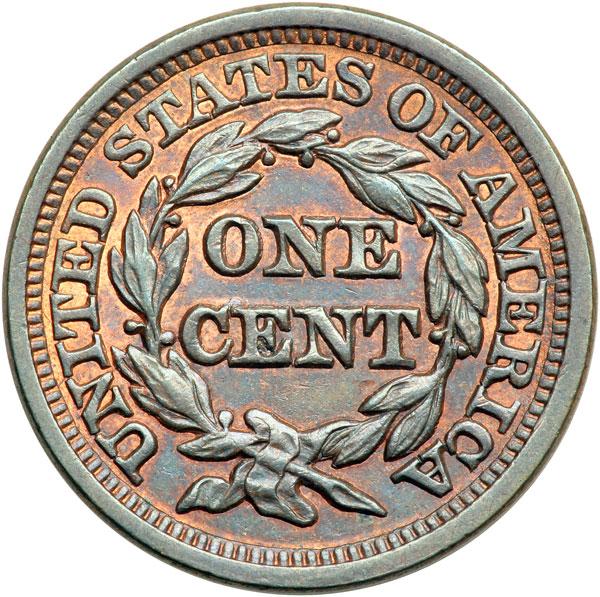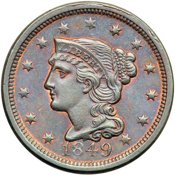 1849 N-9 R4+ MS60+. Frosty bluish steel brown with 10% of the mint red remaining on the obverse, 20% on the reverse. No spots or stains, only very light contact marks, mostly in the obverse fields. The notable marks are a couple very faint nicks in the field between stars 12 & 13, a couple more in the field off the chin, and a tiny planchet chip just left of the notch on the let side of the 8, as struck. M-LDS, die state f, with several areas of crumbling on the reverse, including small crumbles on the lower right of berry 5. CC#2 for this tough die variety, and only two are known in mint state. Removed from an NGC slab graded MS64BN. The attribution is noted on the NGC label, which is included. DWH #2524.