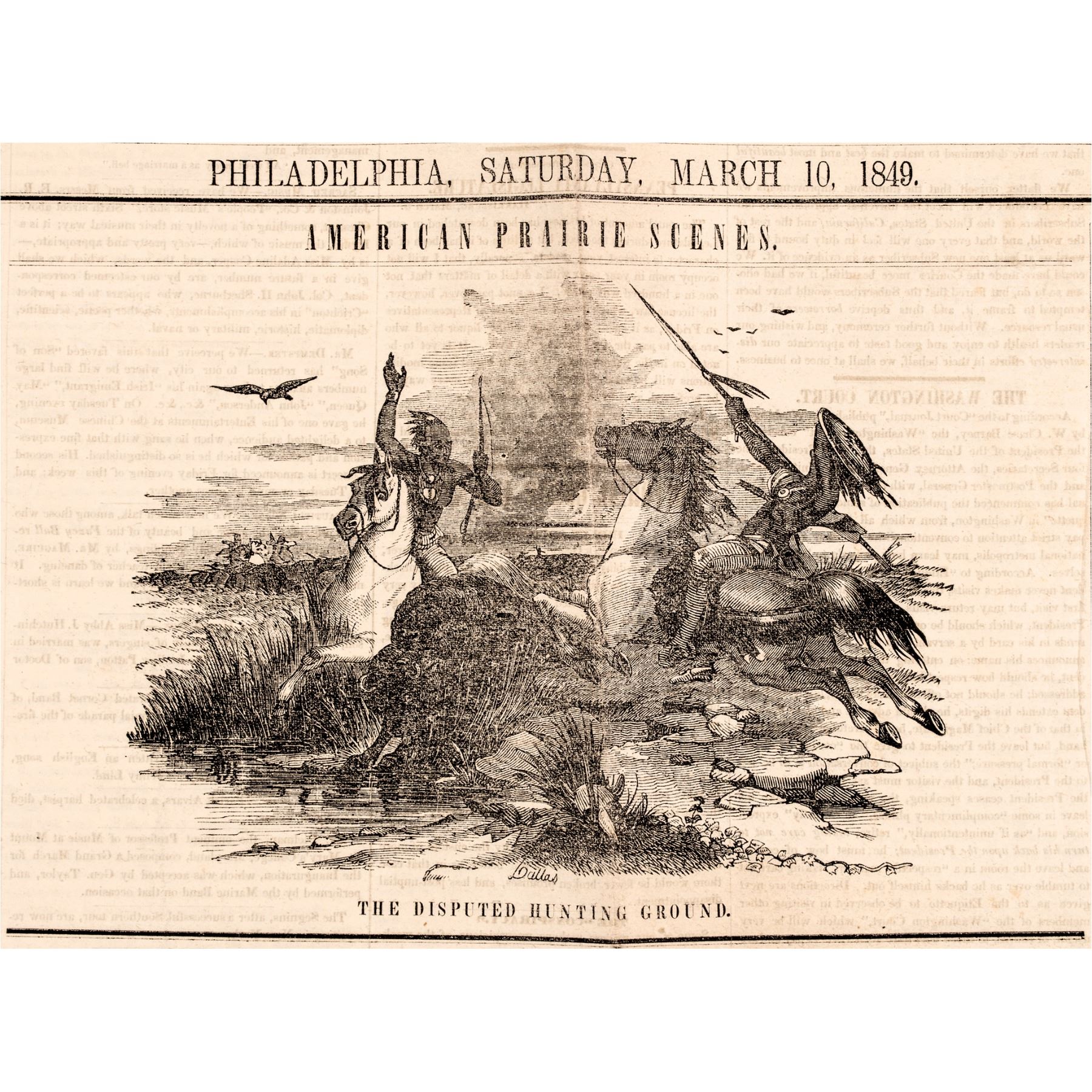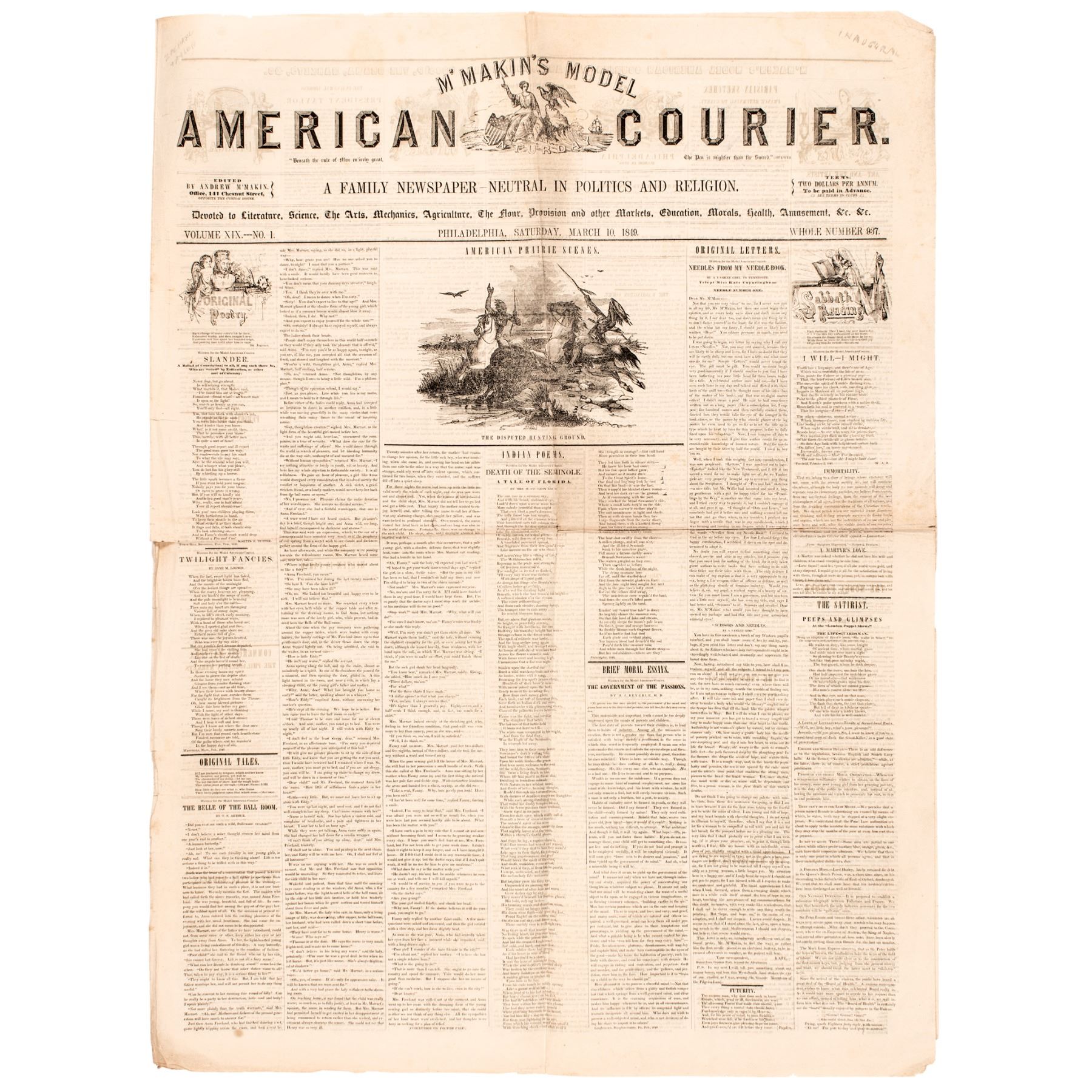 March 10, 1849 issue of "M. Makin's Model American Saturday Courier", a newspaper published in Philadelphia 1848-1851. Illustrated patriotic masthead of Liberty, Shield with American Eagle. Measures about 22.5” x 30”, 4-pages. Large front page illustration of two Indians battling over a buffalo, captioned: "The Disputed Hunting Ground", and below that is an "Indian Poem" titled, "Death of the Seminole. A Tale of Florida". Page 3 has a printing of Zachary Taylor's Inaugural Address, as well as an account of his Inauguration, a list of his new Cabinet, and Presidential Appointments he has made. This large newspaper is folded horizontally and vertically at center, a couple small minor tears, overall nicely printed and presented.