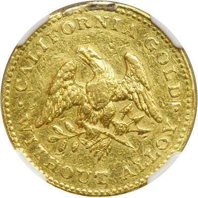 1849 Norris, Gregg & Norris (San Francisco) $5 Gold. Reeded edge. NGC graded AU Details, mount removed. The mount removed is at 12 o'clock and the surfaces are somewhat pebbled. Always in demand as the first of the California private gold coins. Bright greenish yellow gold color. Despite the fact that the identity of the N.G.N. named on the coin was unknown until 1902, when Augustus Humbert's own specimen sold at auction, modern numismatists recognize the historic importance of this coin, believed by many to be the very first gold circulation issue struck during the Gold Rush.