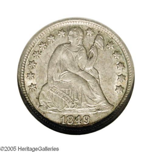 <B>1849-O<10C> MS62 NGC.</B></I> Small Mintmark. Well detailed save for the normal slight softness on Liberty's head, with appealing dove-gray patina over both sides. Although the mintage of the 1849-O isn't particularly noteworthy for an O-mint from this era (300,000 pieces), only a couple of dozen examples appear to have been spared from circulation. Census: 4 in 62, 8 finer (11/05).