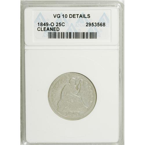 <B>1849-O 25C --Cleaned--ANACS. VG10 Details.</B></I> NGC Census: (3/32). PCGS Population (2/26). Numismedia Wsl. Price: $710. (#5414)<BR><BR><b>Shipping:</b> Coins & Currency (<a target="_blank" href="http://www.heritageauctions.com/common/shipping.php">view shipping information</a>)