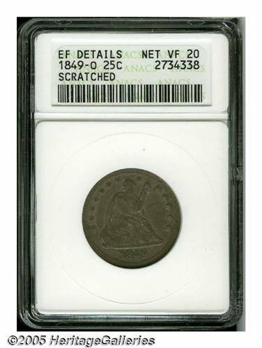<B>1849-O<25C>--Scratched--ANACS. XF Details, Net VF20.</B></I> Medium gray surfaces are relatively clean, save for the obvious scratches across the obverse device. Nicely detailed motifs are displayed and all of LIBERTY is bold.<BR><I>From The Empire State Collection, Part Two.</B></I>