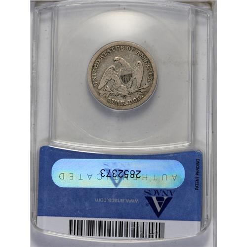 <B>1849-O<25C> VG10 ANACS.</B></I> An important offering. The 1849-O Seated Liberty quarter is a rare date in the series, from an unknown but limited mintage. For some reason, the New Orleans Mint did not record any examples of this date, but included the mintage of this issue with the reported mintage for the 1850-O quarter. Most observers would call this example F12. LIBERTY is actually complete, although the L is extremely weak. Pleasing light to medium gray surfaces.